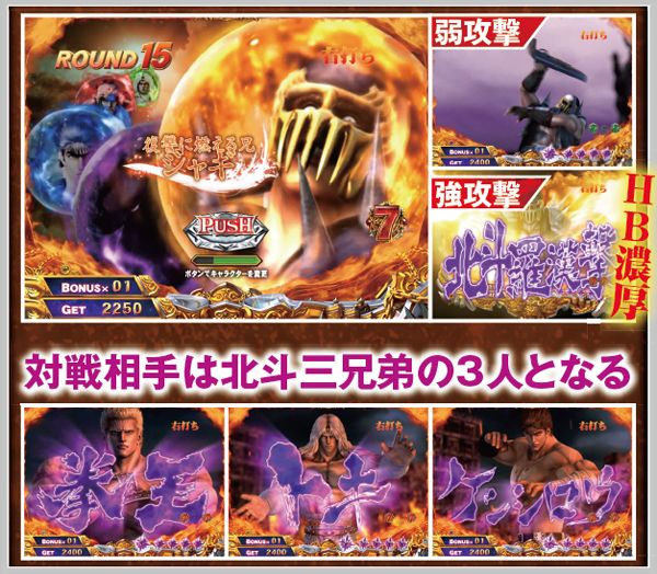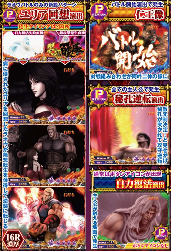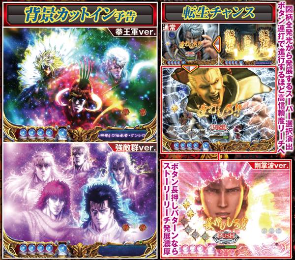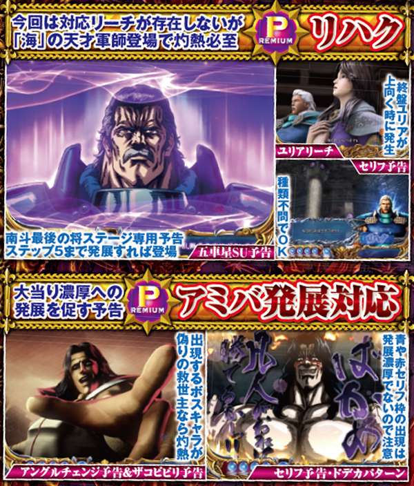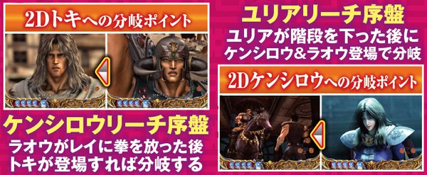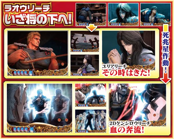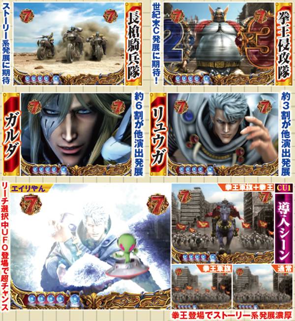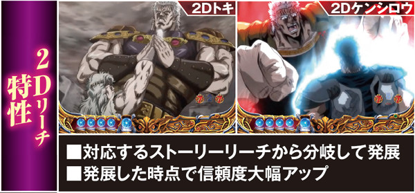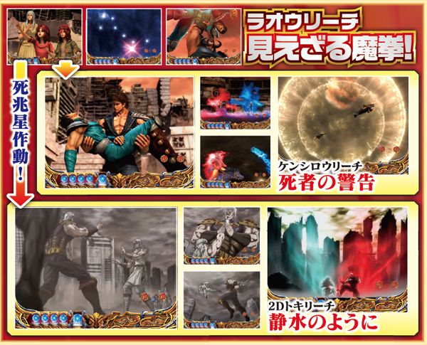 原作の名場面を描いたストーリー系も、新要素盛り沢山で格段に進化している。特に、2種類のラオウリーチは進行中に死兆星が飛び出す事で、高期待度の2Dリーチへと切り替わる「分岐」の存在に要注目。発生した時点で信頼度が急騰する超重要アクションなのだ。