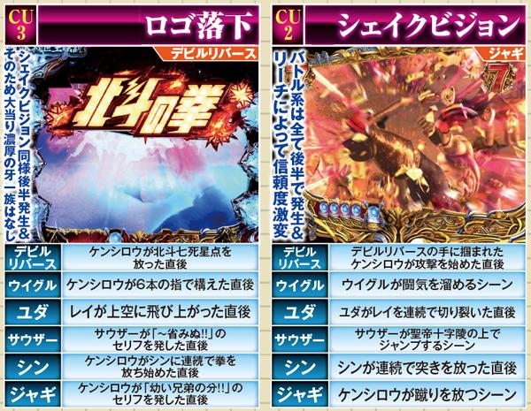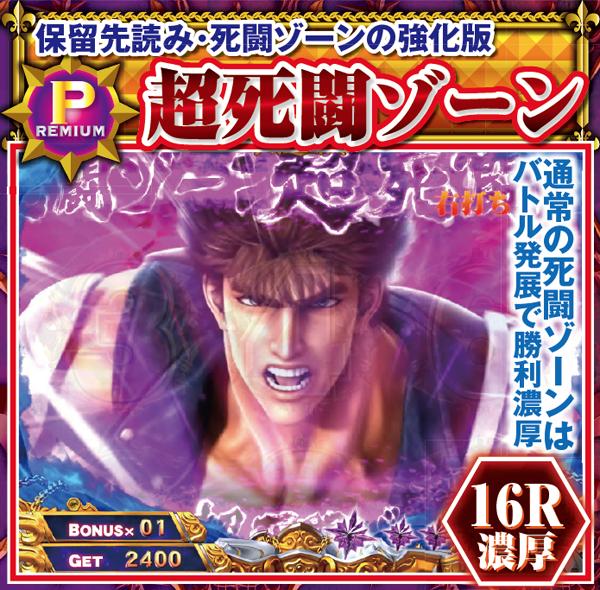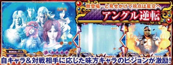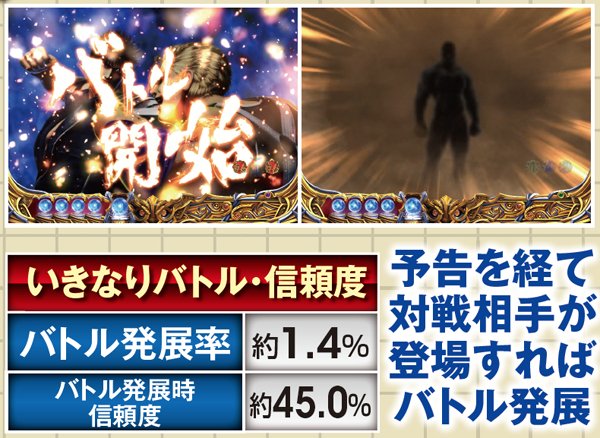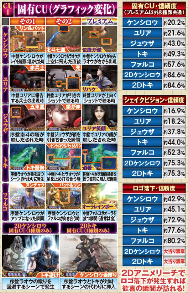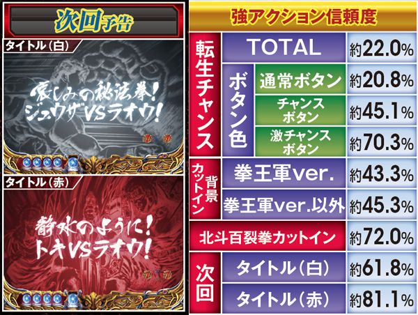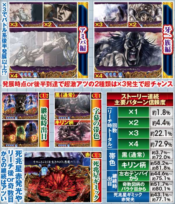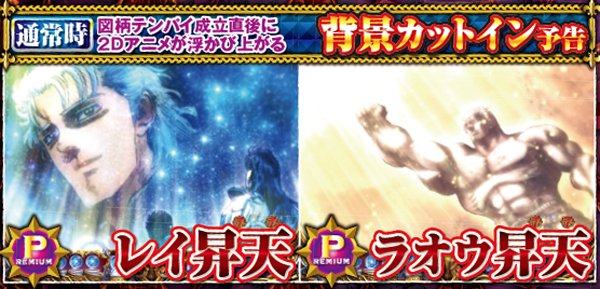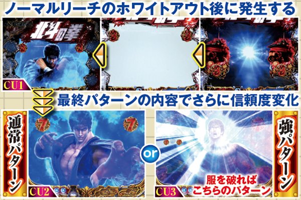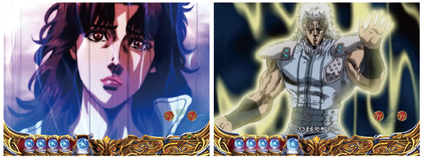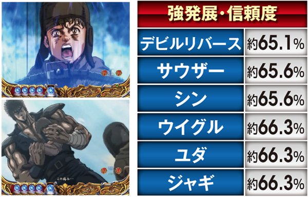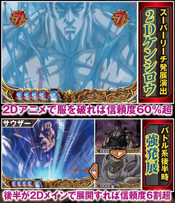 スーパー発展時&スーパーリーチ中にもチャンスアップは数多く搭載されているが、中でも2Dアニメ展開パターンは高信頼度の傾向を誇る。また、拳王軍リーチではストーリー発展濃厚となるチャンスアップ出現に期待しよう。