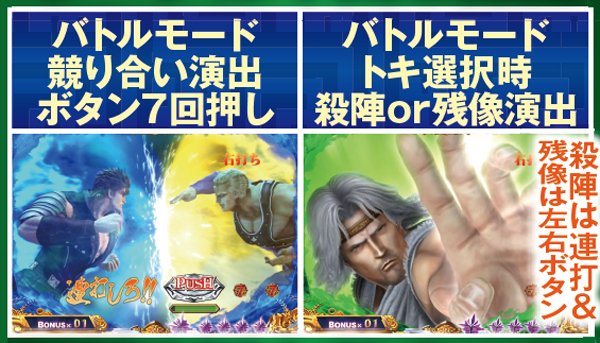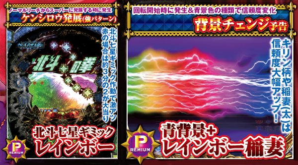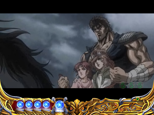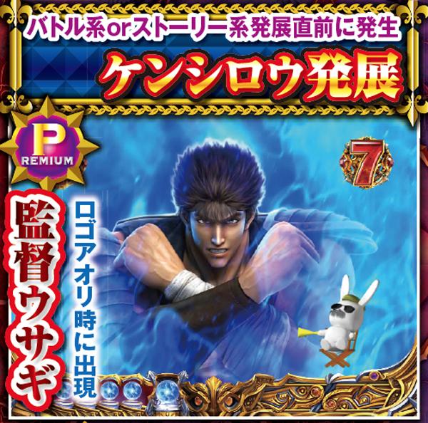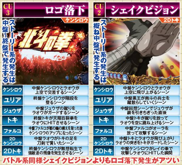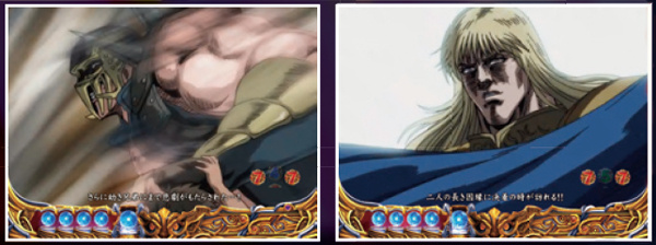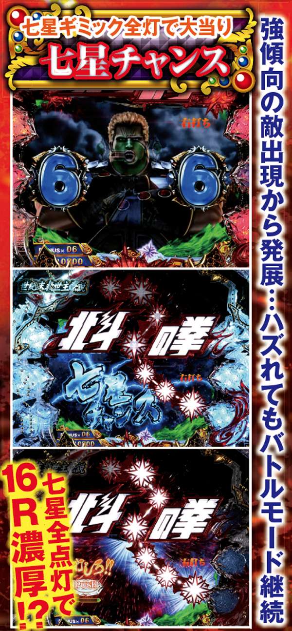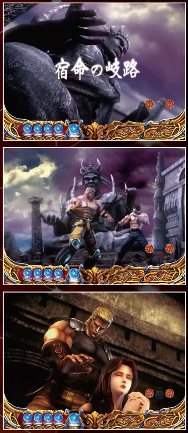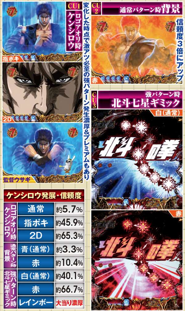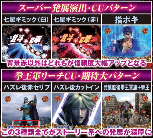 バトル系orストーリー系への発展時にケンシロウが登場、そのアクションや背景の色などで期待度を示唆する。2Dパターンや指ポキなら激アツだ。また、北斗七星ギミックが完成する強パターンは、バトル系後半orストーリー系への発展が濃厚となる。