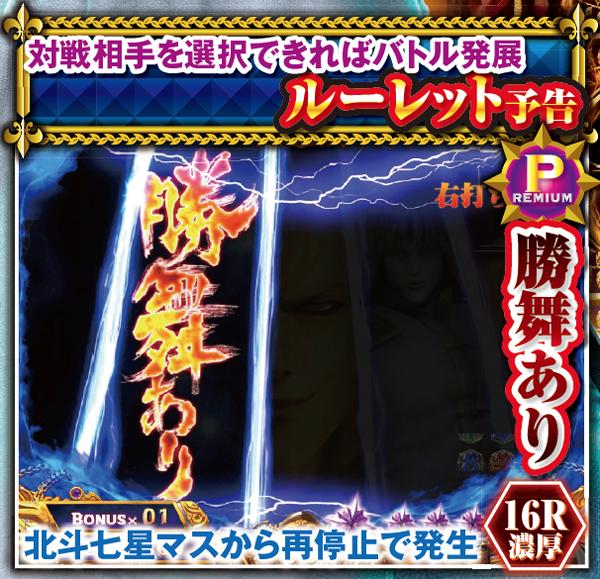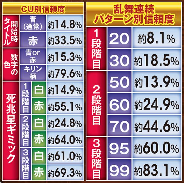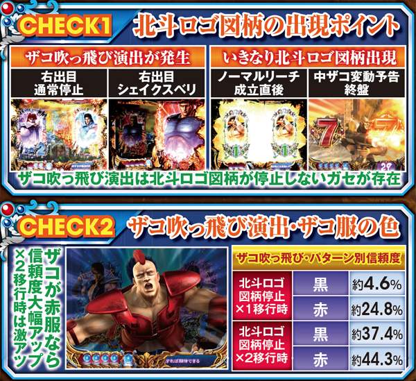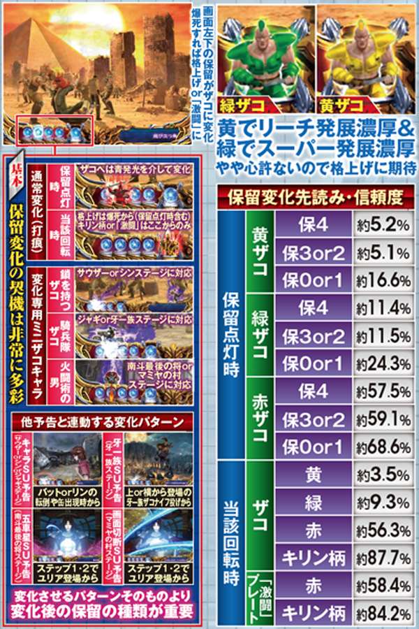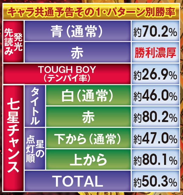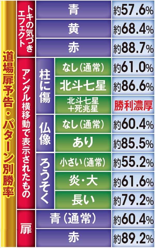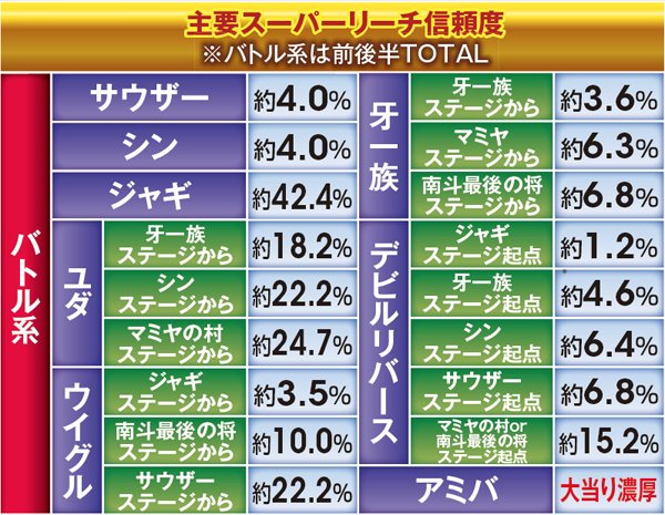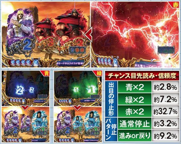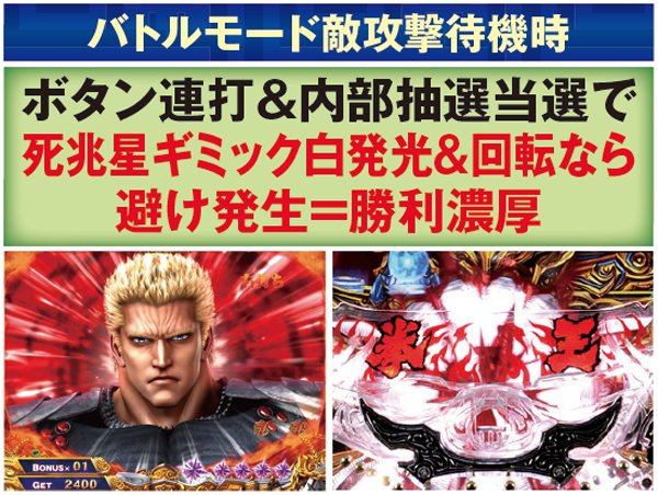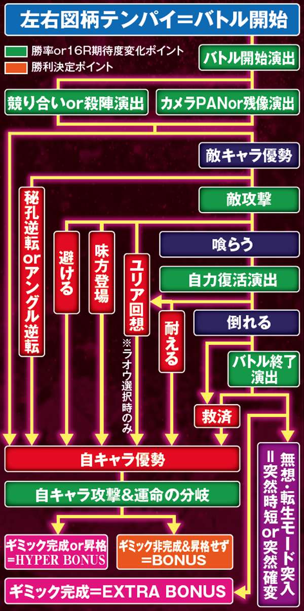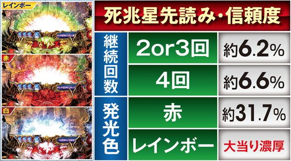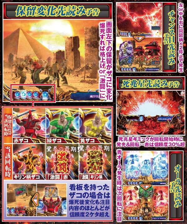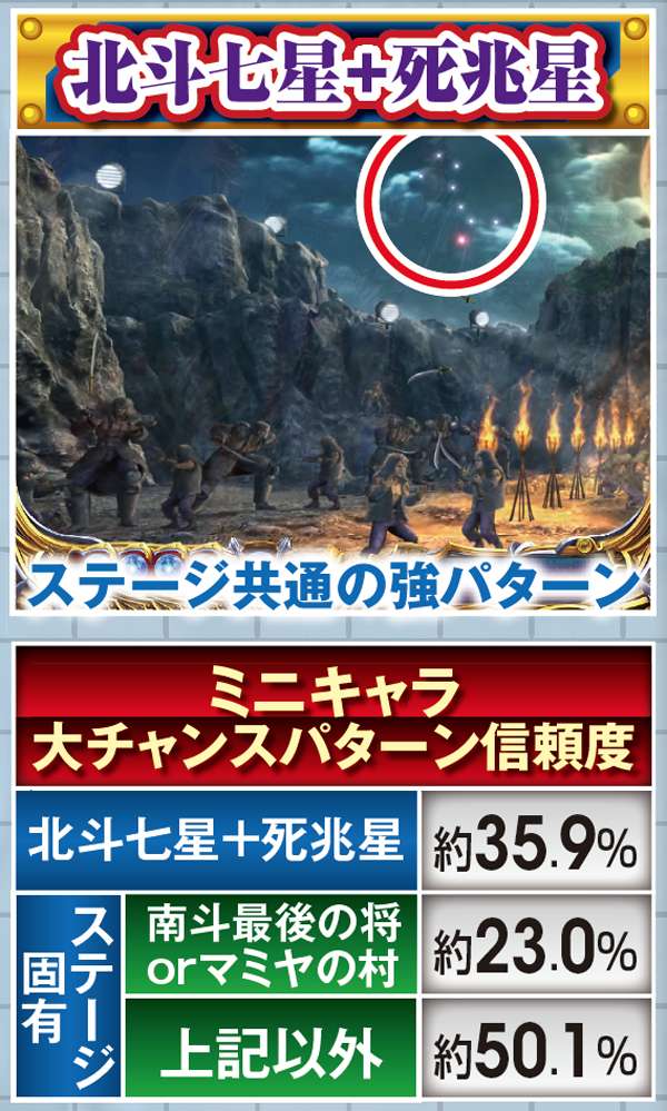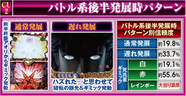 バトル系後半発展時は、死兆星の色に注目。赤なら5割超が大当りに結び付くぞ。ハズレと思わせ後半に進む遅れ発展は、通常パターンよりも好機だ。