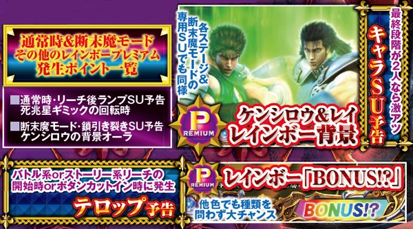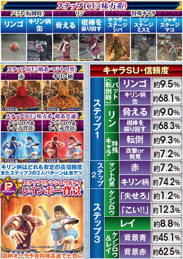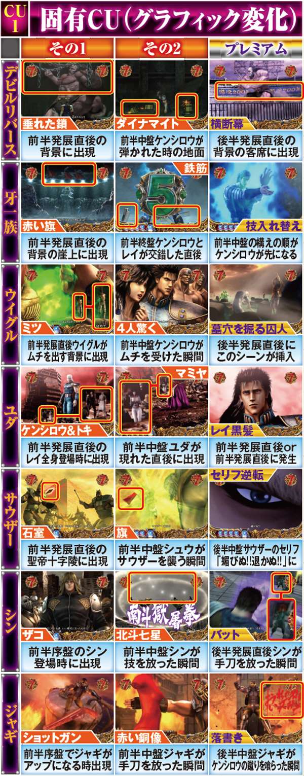 味方系と敵系のSUがステージごとに存在し、各段階に強力なチャンスパターンが搭載されている。特にステップ3のケンシロウ&レイに到達した時の期待度は青背景でも約45%、赤背景なら約60%と、発生時点で大チャンス。