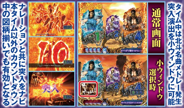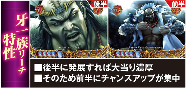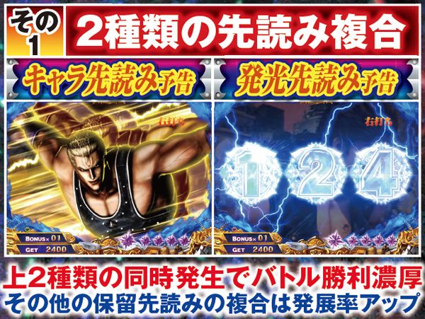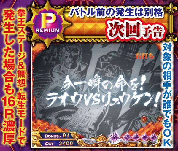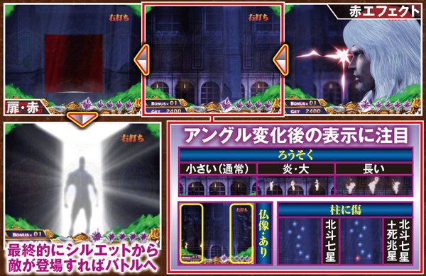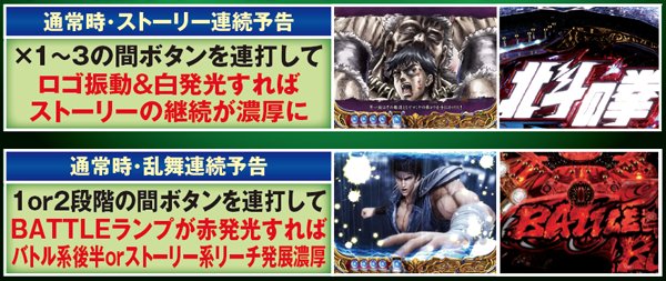 拳王軍に属する人物がステップアップ式に登場するリーチだが、こちらも直当りの可能性は低いため、ストーリー系や世紀末チャレンジ発展に期待。導入シーンや、ハズレ後のコメント&カットインなど、各所にチャンスアップが散りばめられているので、見逃さないように注意したい。