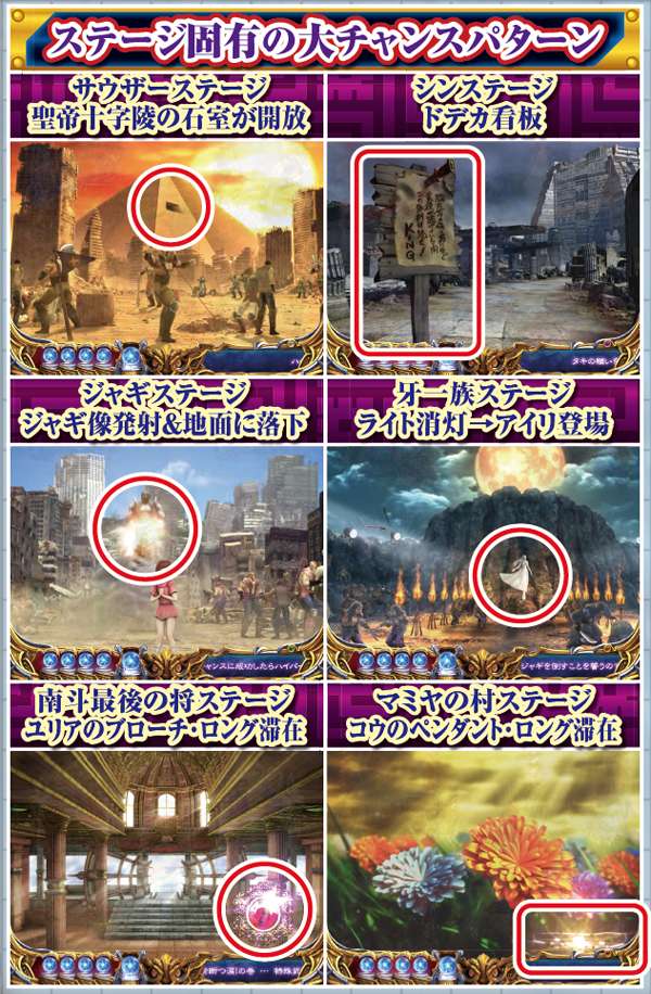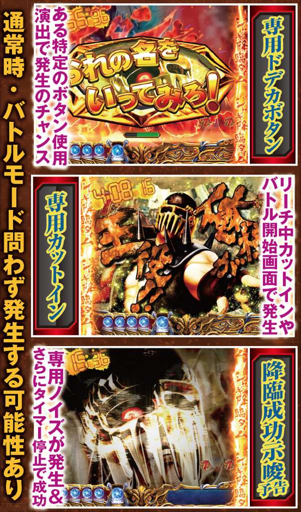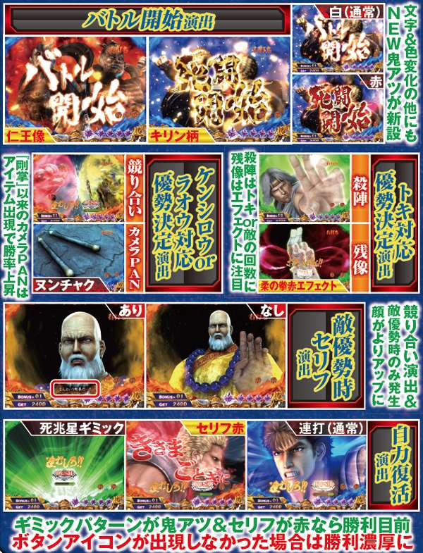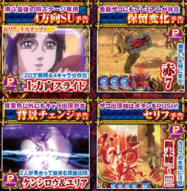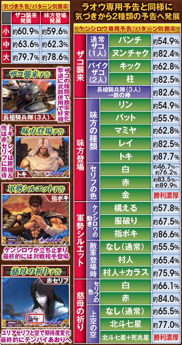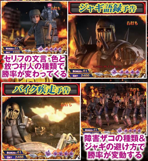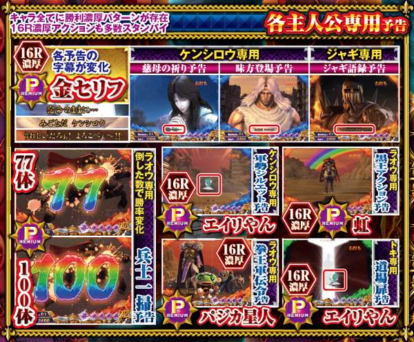 多彩な専用予告では、チャンスパターンの出現が勝利への重要な鍵となる。ザコ襲来ではケンシロウが武器を使うか否かに、味方登場予告では誰が登場し何色のセリフを発するのか、軍勢シルエットではケンシロウのアクションと背景に注目だ。