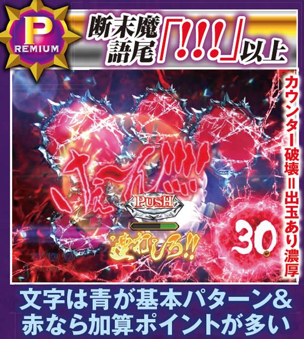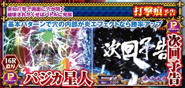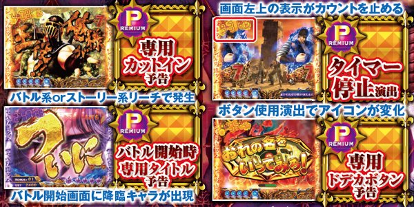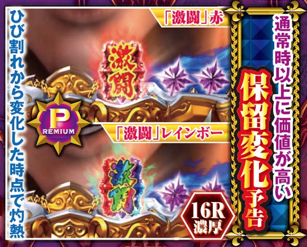 従来のシリーズ機に搭載されていた予告も継承&進化している。特に保留変化予告の出現は絶好機。ひびわれは、上位保留昇格のチャンス&バトル発展のハードルを越えた時点で勝利濃厚。「激闘」の文字を確認できればその時点で超激アツ!?