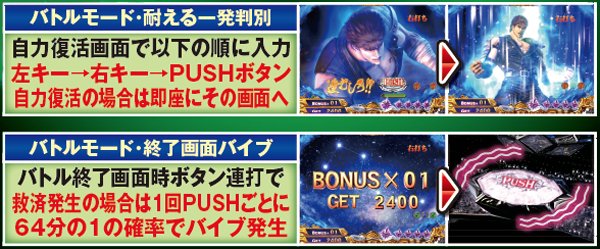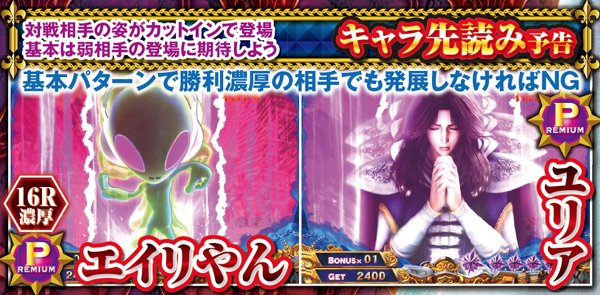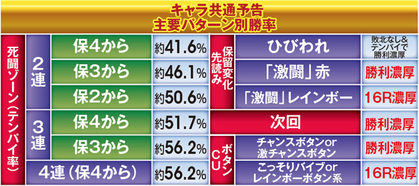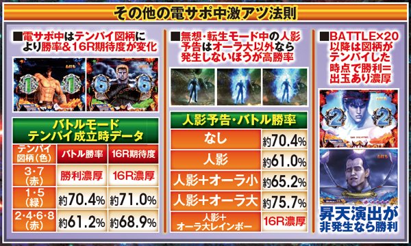 バトルモード中、上にある2つの保留先読みが複合すれば、どんな強敵が相手でも心配無用、勝利濃厚となる。また、テンパイ図柄ごとの勝率&16R期待度の変化や「昇天条件達成後のバトル発展=連チャン濃厚」など、シリーズ機でおなじみだった法則も色濃く受け継がれている。