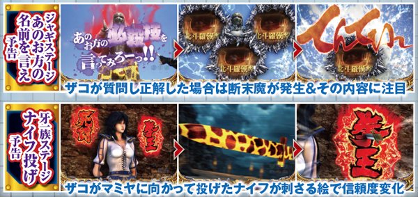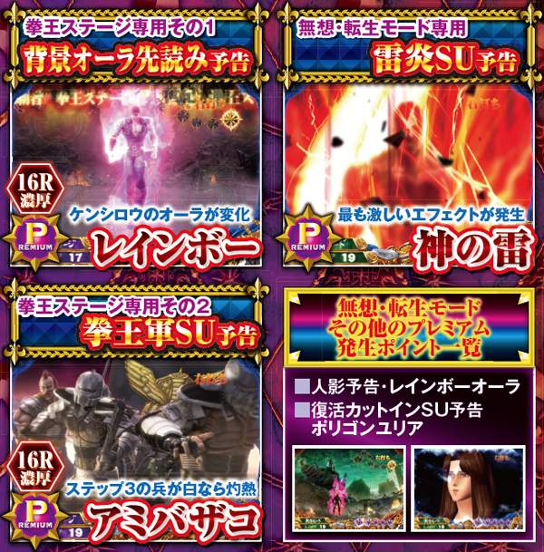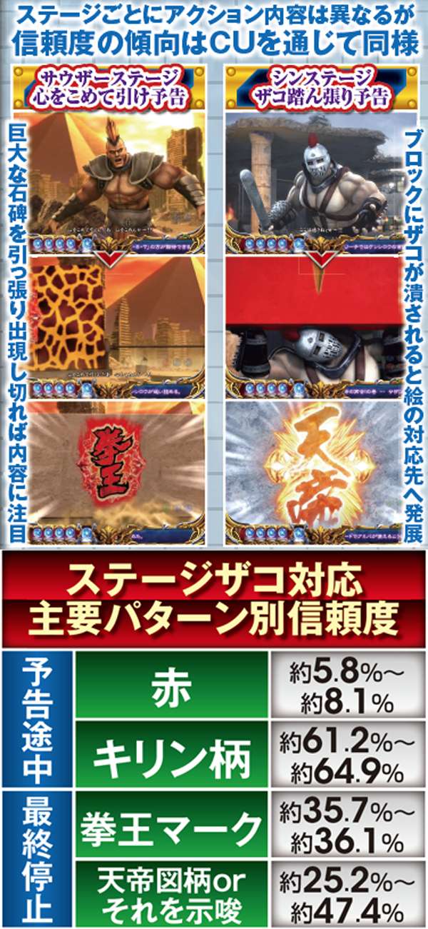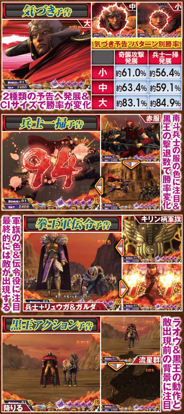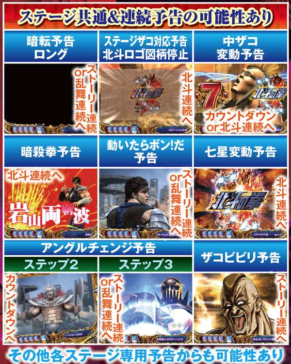 各ステージに対応した予告で、それぞれ固有のアクションが展開。ステージ如何にかかわらず、キリン柄や天帝ゾーン突入を示唆する演出は高信頼度の傾向にある。拳王マークが最終停止した場合はストーリー系への発展が約束される。