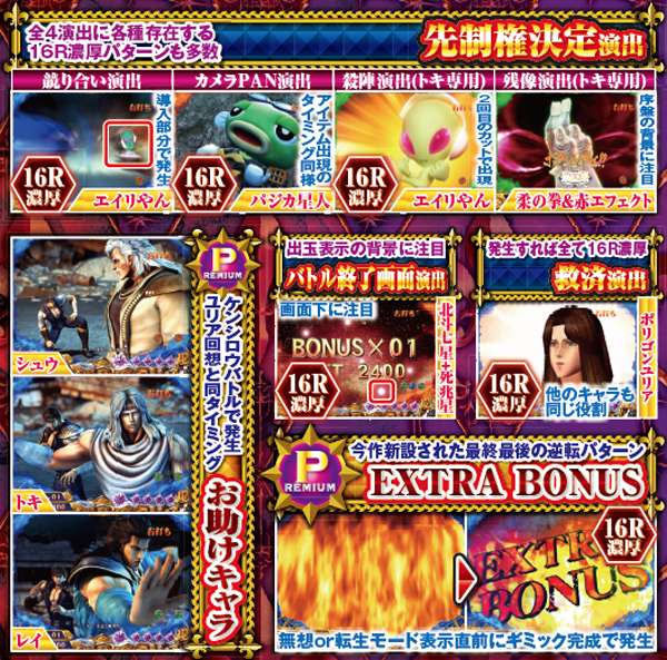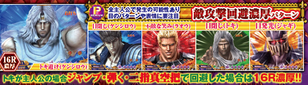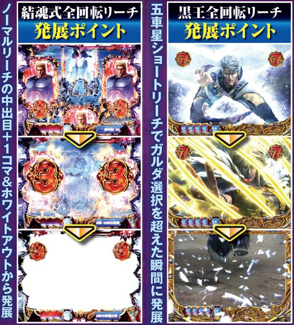 16R確変大当り濃厚の激レアアクションである2種類の全回転リーチは、それぞれ発展タイミングが異なる。黒王全回転は拳王ロング最終段階到達、結魂式全回転はスーパー発展のタイミングで、原作の名シーンが流れ始める。