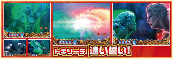 拳王タイトル表示から死兆星が飛び出せば、ケンシロウとラオウ最後の闘いを描いた本機最強リーチに発展だ。発展時点で8割超の信頼度が、シェイクビジョン発生で9割近くまで上昇、ロゴ落下発生やケンシロウ視点でリーチが展開すれば歓喜の瞬間は目前となる。
