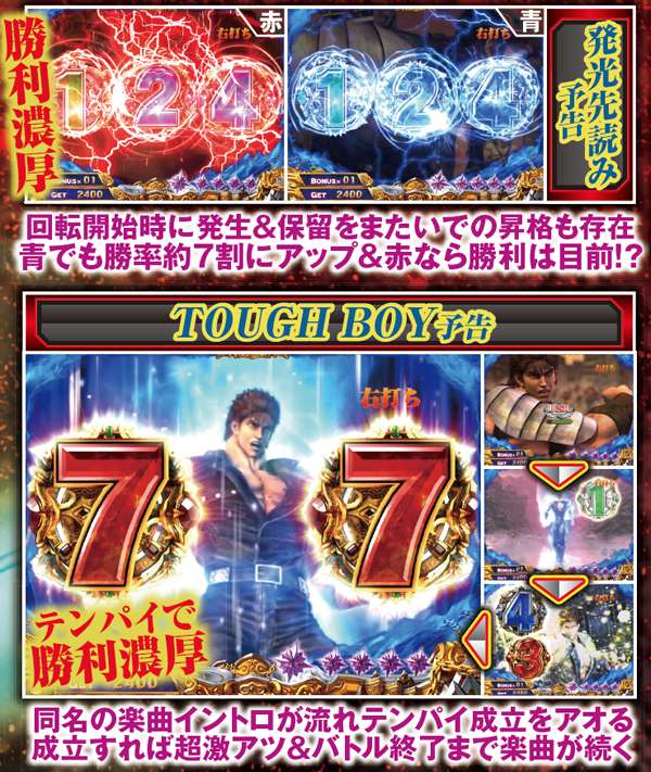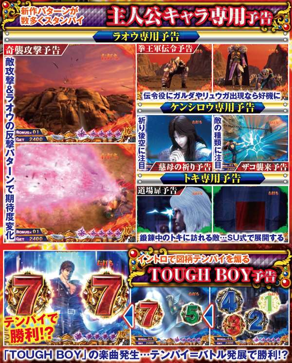 自キャラ不問で出現する予告にも、本作『拳王』から搭載された激アツ新予告が盛り沢山。テンパイ成功で勝利濃厚となる「TOUGH BOY予告」や、成功で16R・失敗でも確変継続となる「七星チャンス」には注目だ。