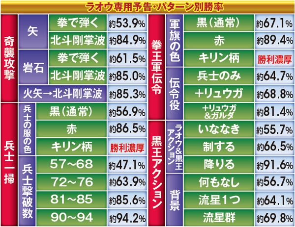 専用アクションが多く用意されたラオウだが、それぞれ期待度には大きな差が存在。各アクションのチャンスパターンを把握しておこう。もちろんキリン柄は、出現で勝利濃厚だ。