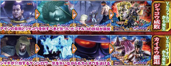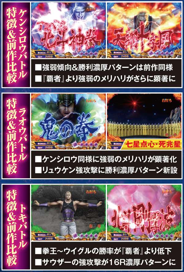 細かい数値に若干の差はみられるものの、対戦相手の信頼度傾向は前作『覇者』を継承。ラオウ選択時の最大の難敵リュウケンと対峙したと際に、燦然と煌く死兆星を目撃出来れば勝利濃厚となる新法則等にも注目。
