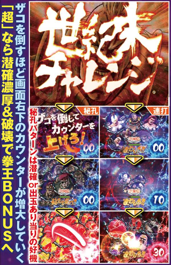 主に図柄全消灯や弱リーチから発展し、潜確や拳王BONUSの契機となる。ボタンを押してザコを撃破する度に液晶右下にあるカウンターの数値が上昇、最終的に溜まったポイント数で発展先が変化。30までは断末魔モードへ移行、カウンターが割れれば何らかの出玉あり当りが濃厚となる。