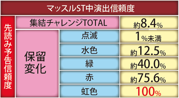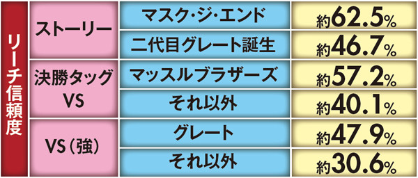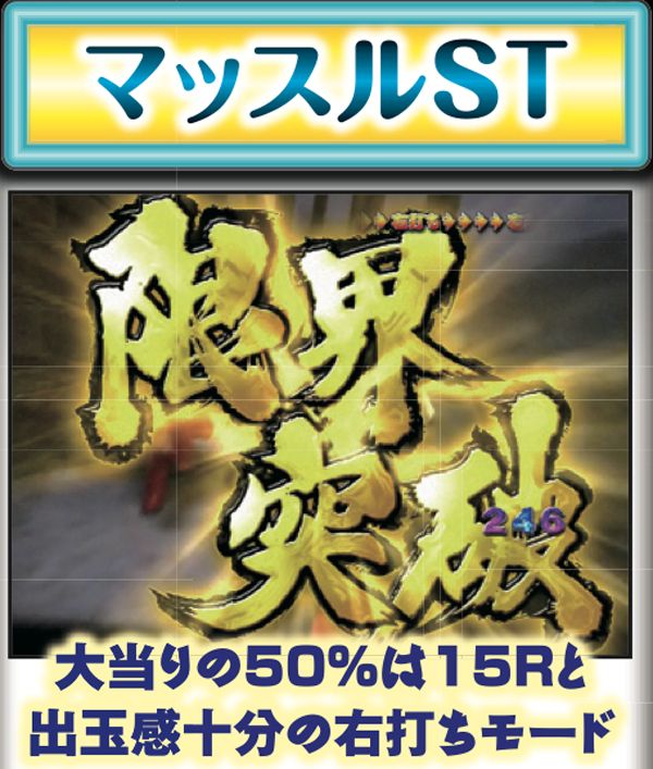リーチでバトルが発生し、勝てば大当りの右打ち電サポ90回転。たとえ90回転以内に勝利できなくても、限界突破が発生すれば、まだまだマッスルSTは継続するのだ!