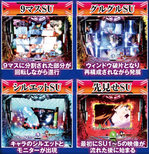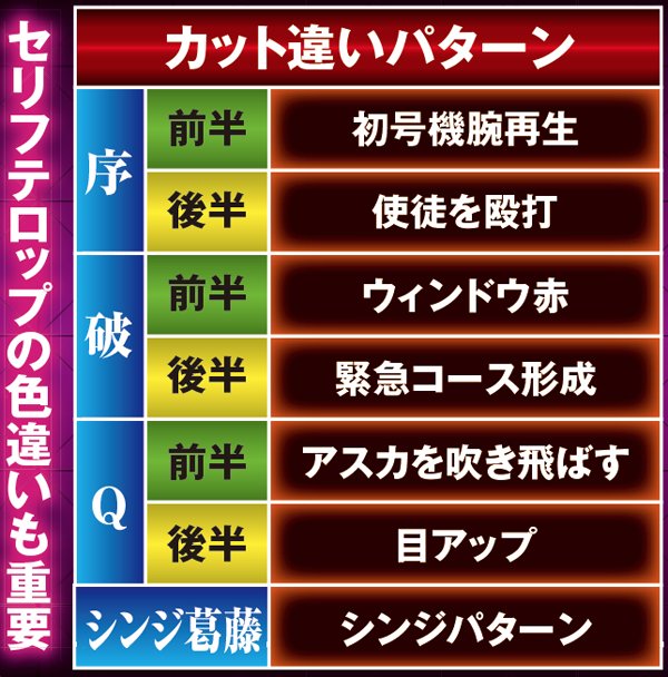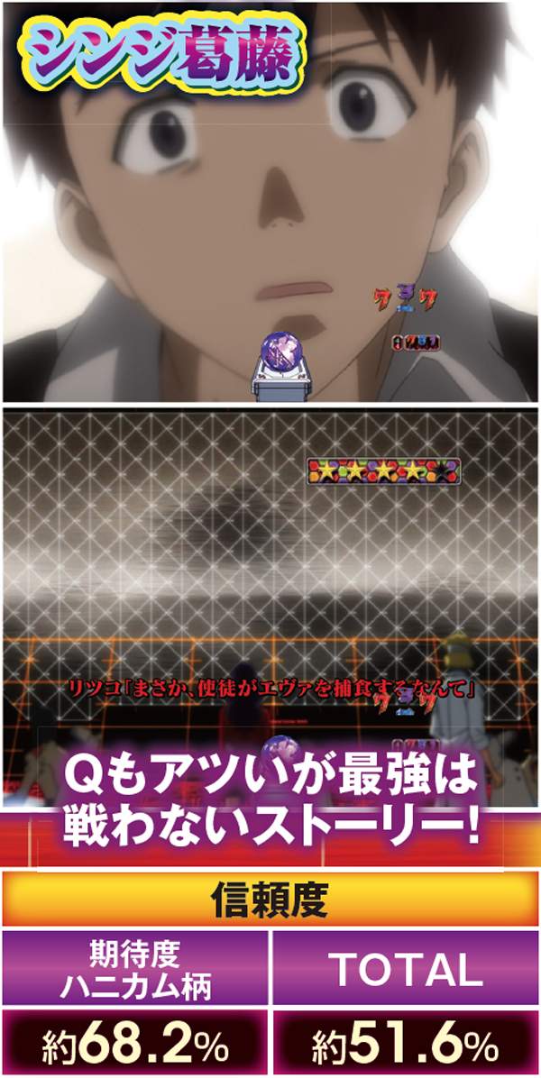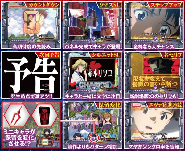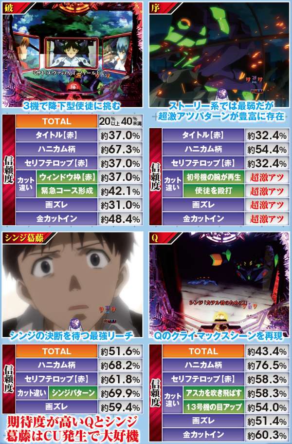 4種類あるストーリー系の期待度は、序→破→Q→シンジ葛藤の順。各リーチに数多くのチャンスアップが存在するので要チェックだ。