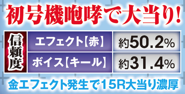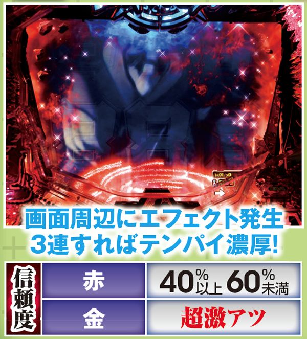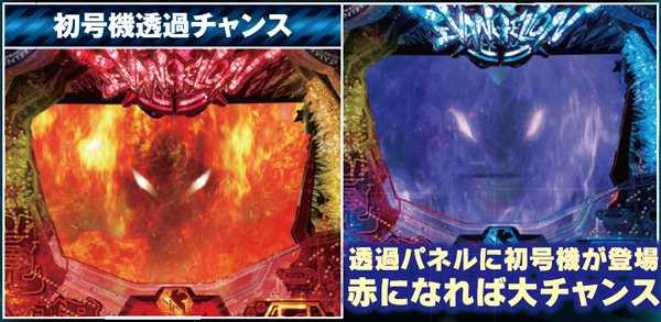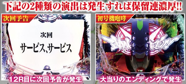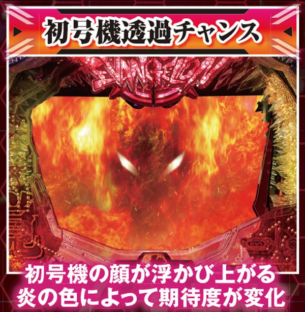 役モノ作動系の予告は、赤以上のチャンスアップを伴うだけでも相当アツい。期待度約70%の初号機・赤炎は特に期待できる。