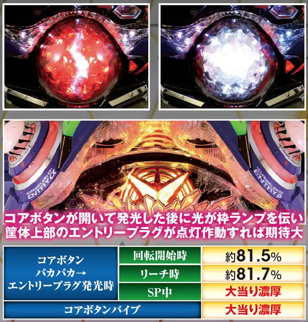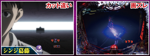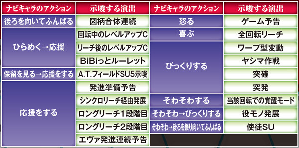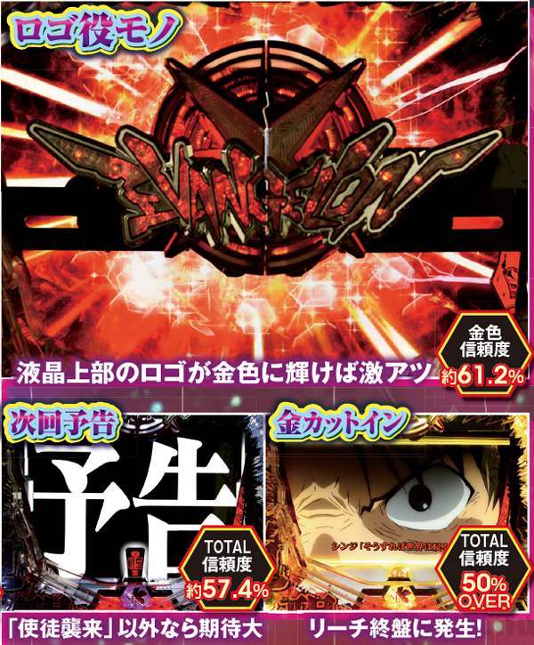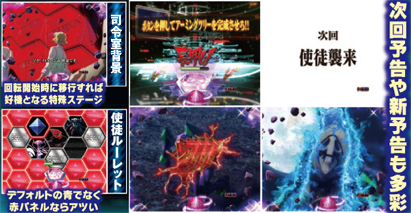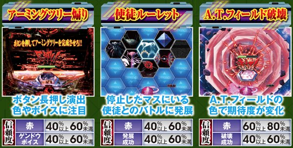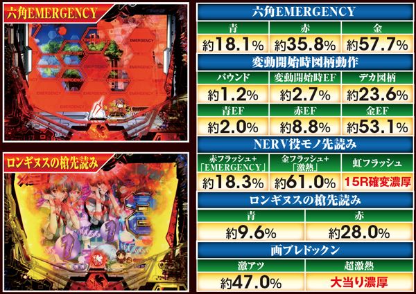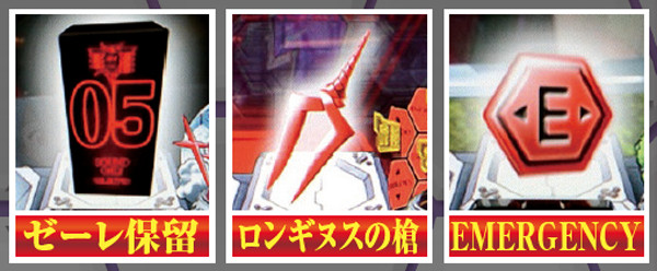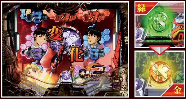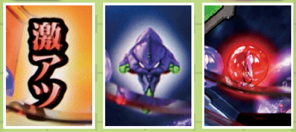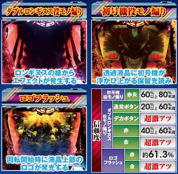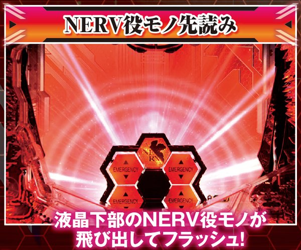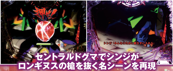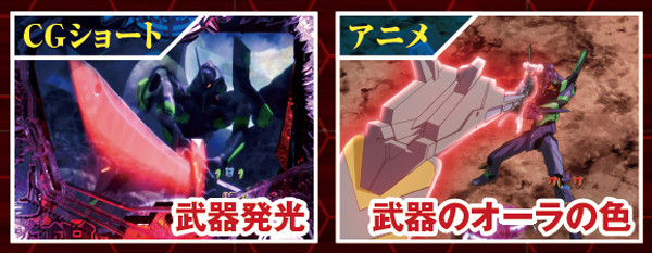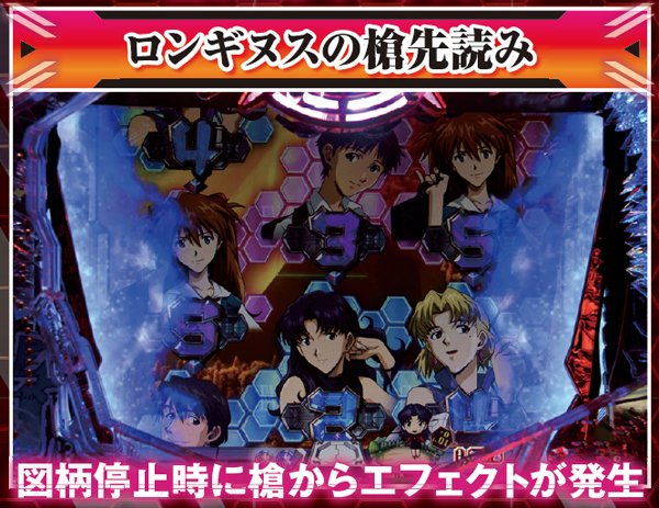 NERV役モノは回転開始時orノーマルリーチ中、ロンギヌスの槍役モノは図柄停止時に作動し、光る。どちらもエフェクト色がカギを握る先読み演出だ。