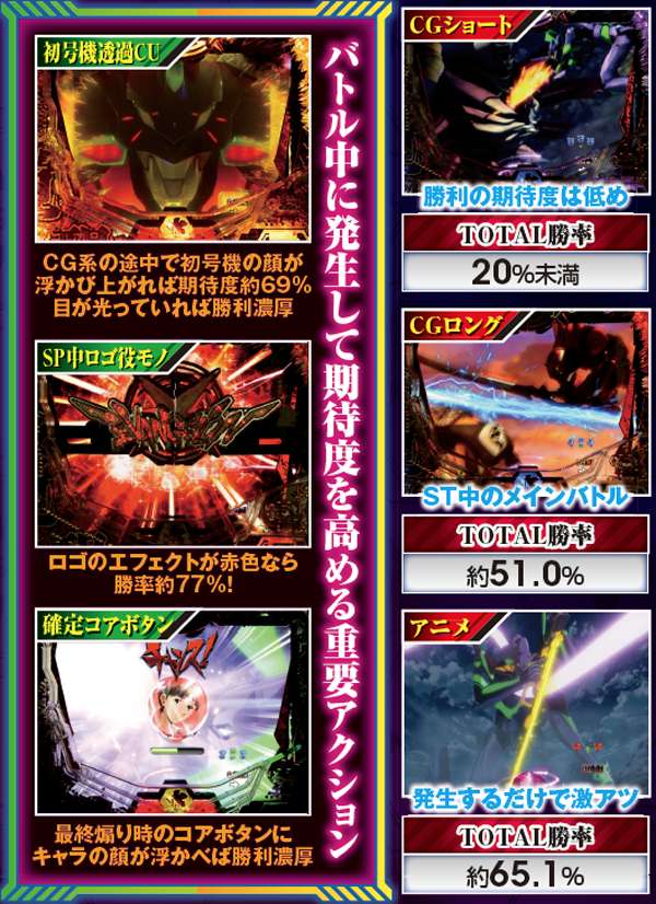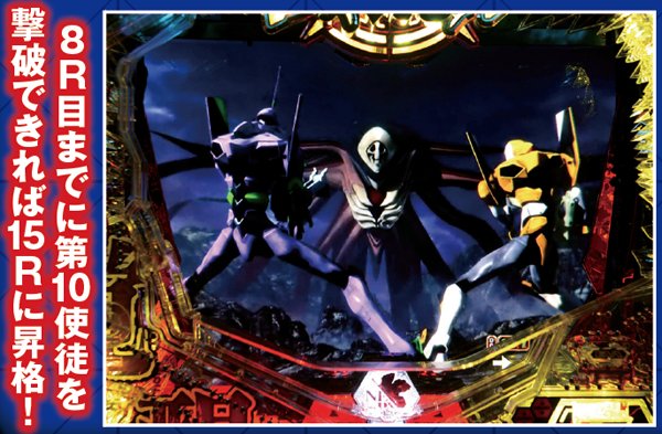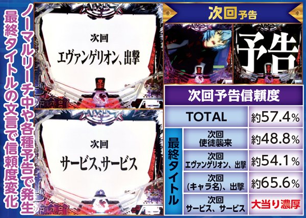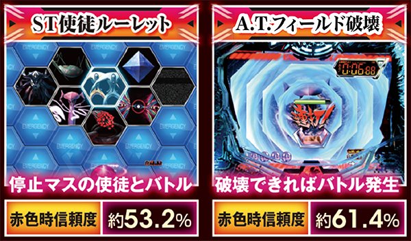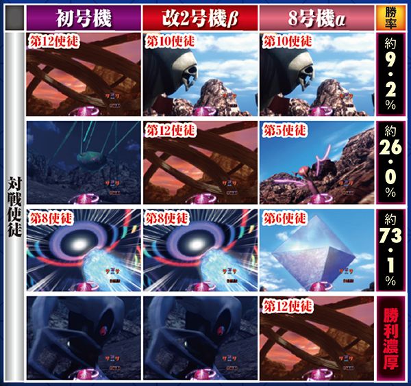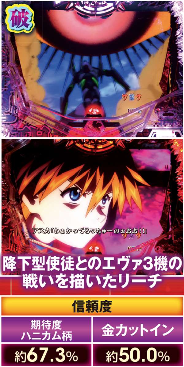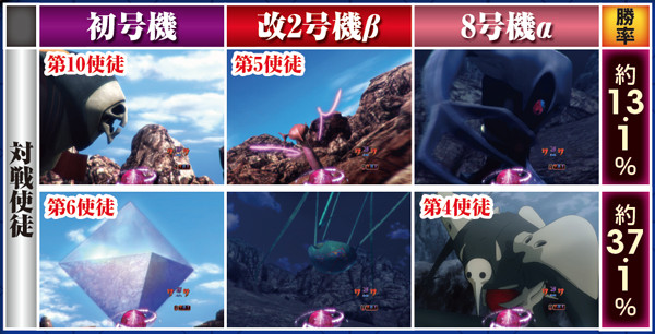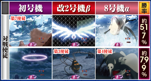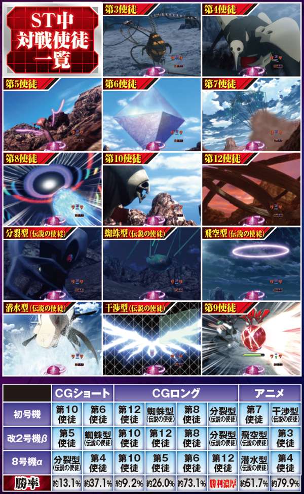勝敗が決するポイントは多岐に渡り、大当りにもよく絡む本機ST中の主要リーチ。対戦使徒によって勝率が大きく変化する傾向にある。