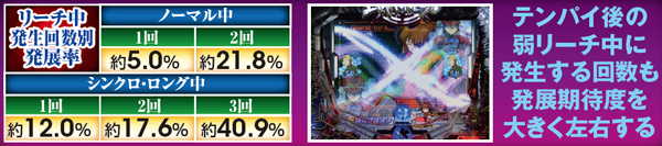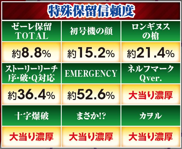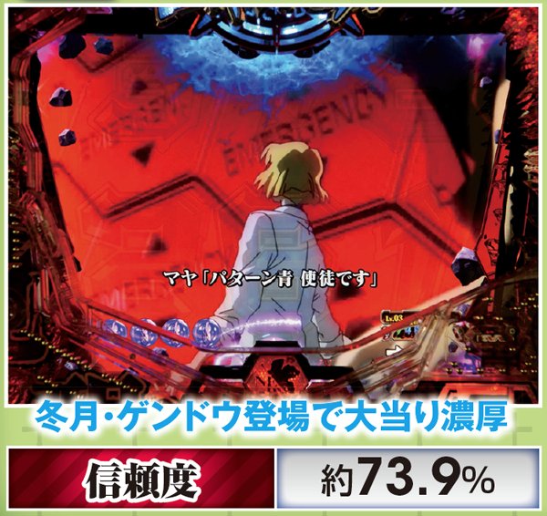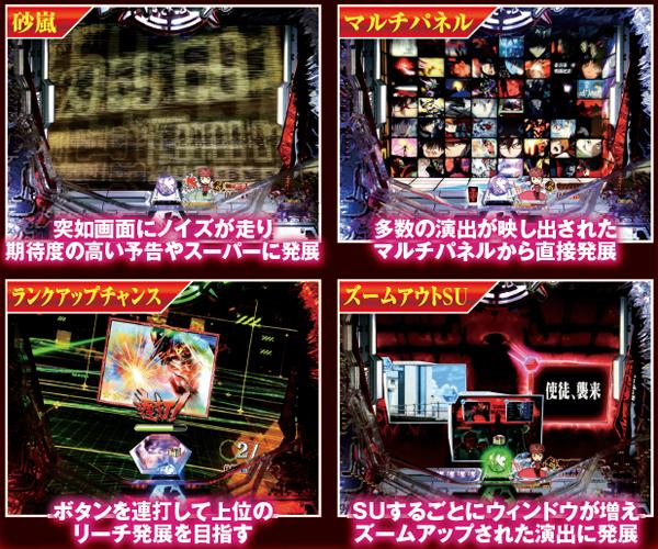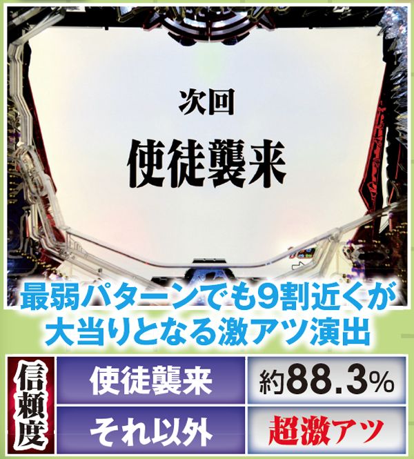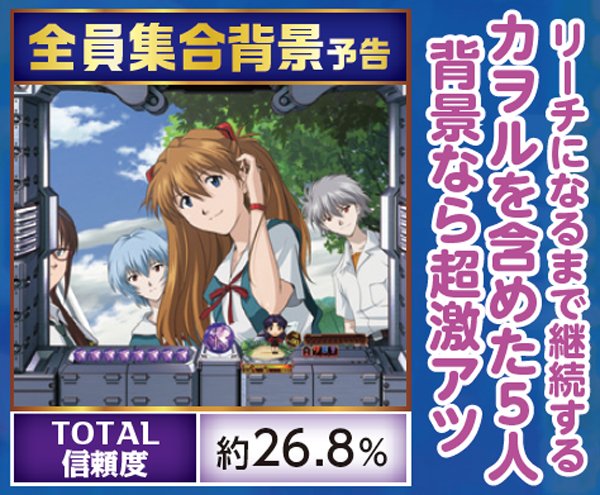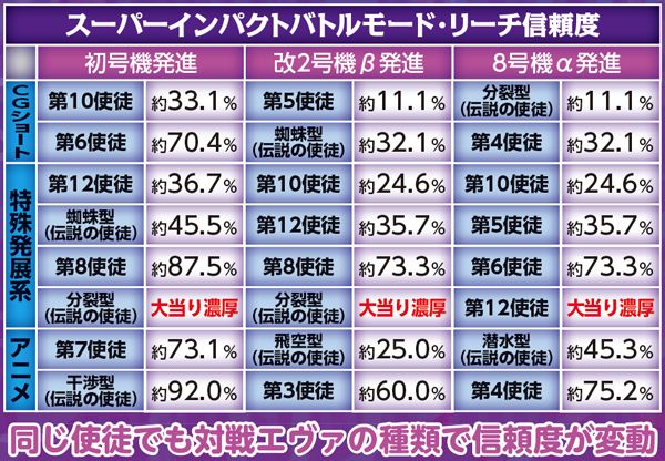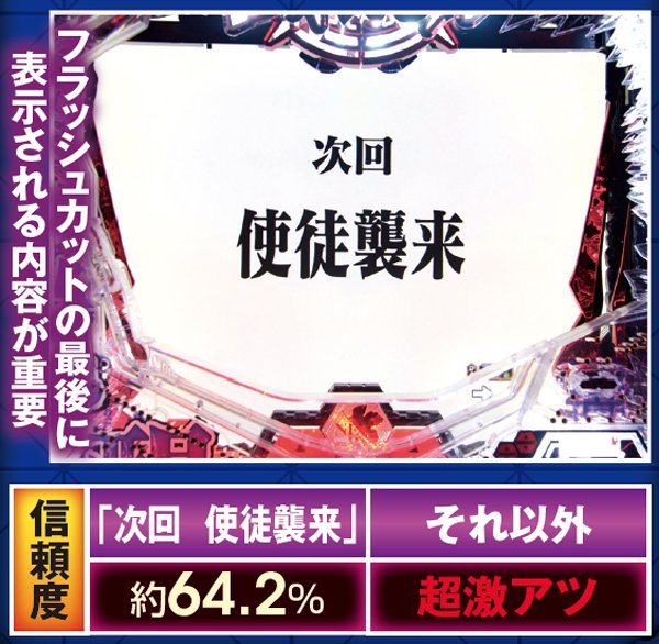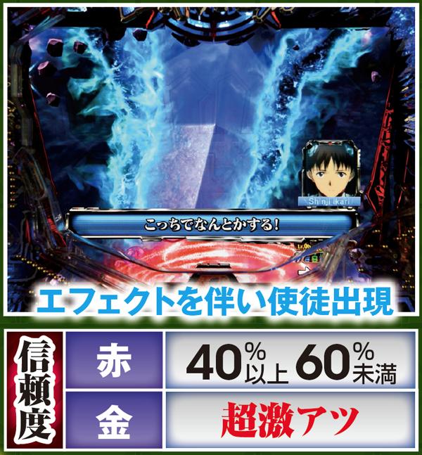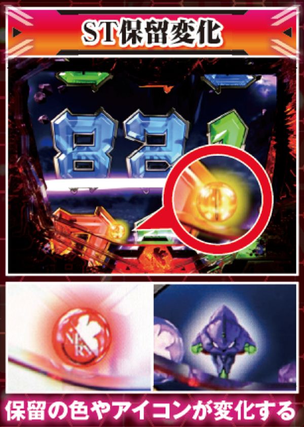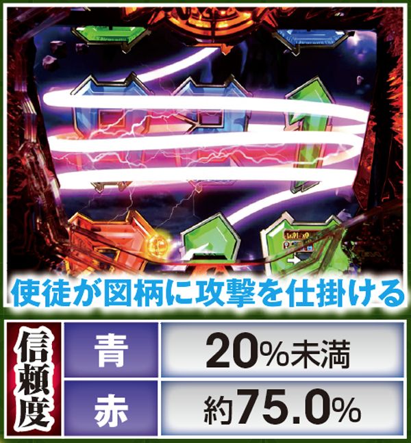 勝敗が決するポイントは多岐に渡り、大当りにもよく絡む本機ST中の主要リーチ。対戦使徒によって勝率が大きく変化する傾向にある。