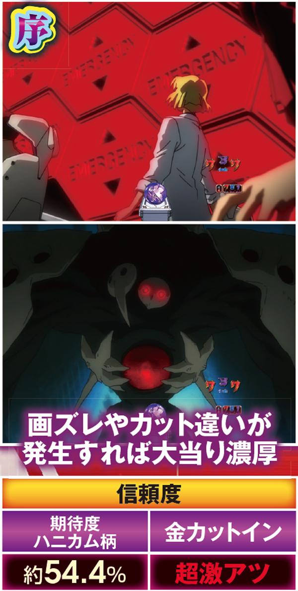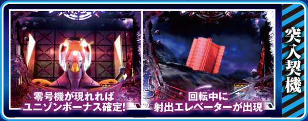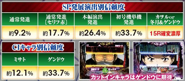 SP発展時に挿入されるエヴァ射出ムービーは複数存在し、種類によって期待度が変化する模様。カットインキャラや背景色にも注目したい。