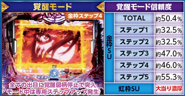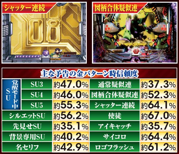 覚醒図柄の3つ揃いから突入する先読みゾーン。突入後は予告が「金」のSU予告に限定されるため、自ずとその後の展開に期待が持てる仕様だ。