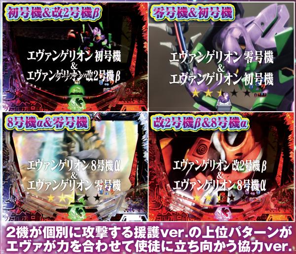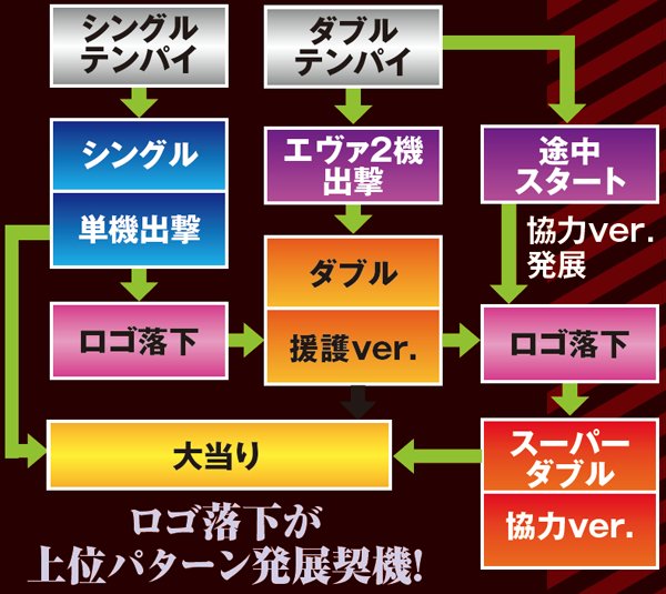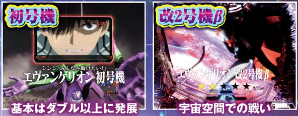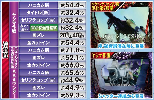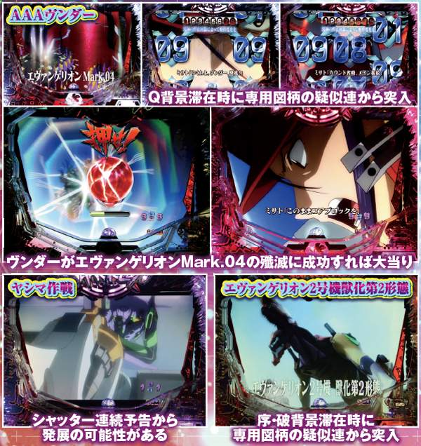 「ヴンダー」と「2号機獣化第2形態」へは専用図柄の疑似連から、「ヤシマ作戦」へは「シャッター連続予告」から発展。これらのリーチ中にもチャンスアップは存在する。