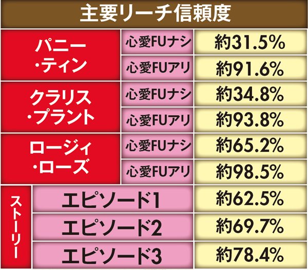 リーチではVS系に発展すればチャンス。特に相手がロージィー・ローズなら激アツ。ストーリー系はエピソードが進むほど期待できる。