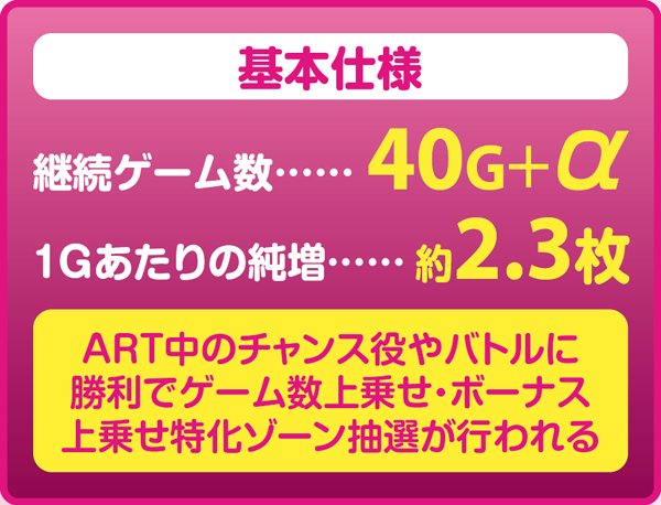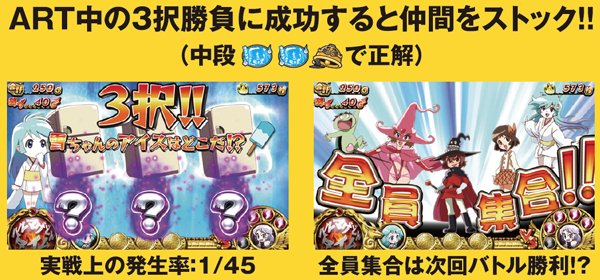 ARTは消化していくと仲間が増えることがあり、パーティーに加わっている仲間によってはバトル時の勝率がアップすることも。バトル勝利時は上乗せや特化ゾーン突入のほかボーナスの場合もあり、さらにそのボーナスで上乗せ…といった展開もあるのだ。