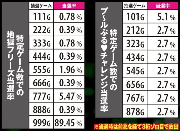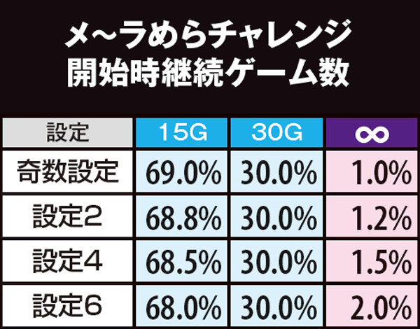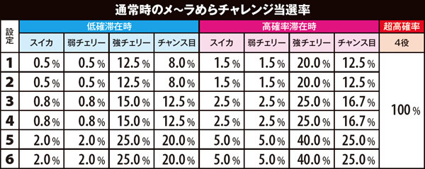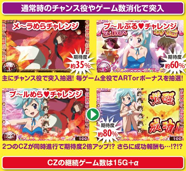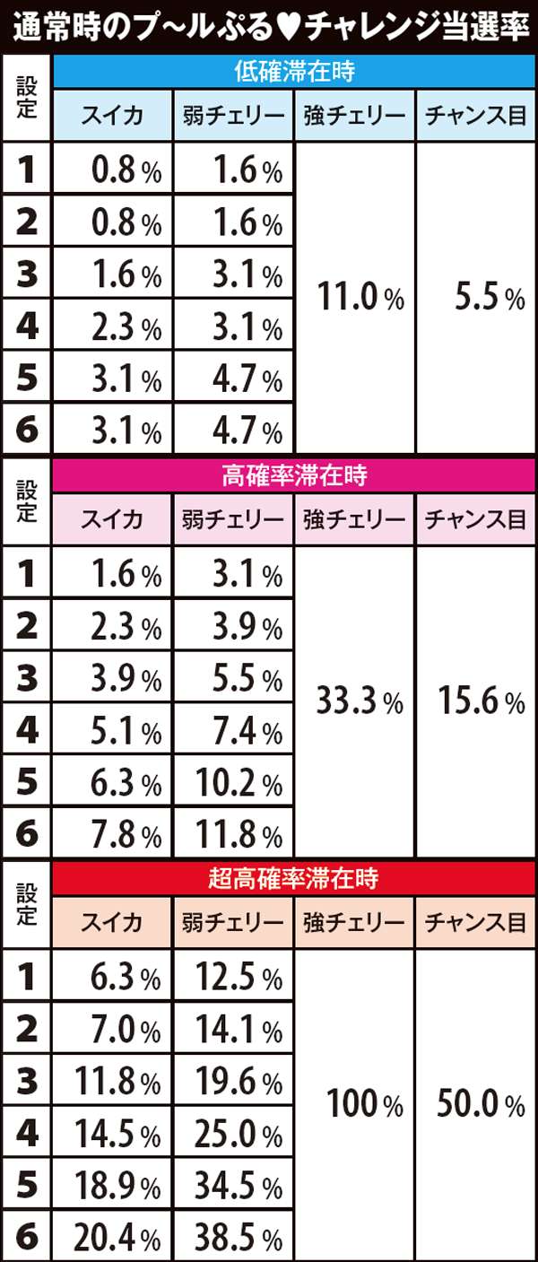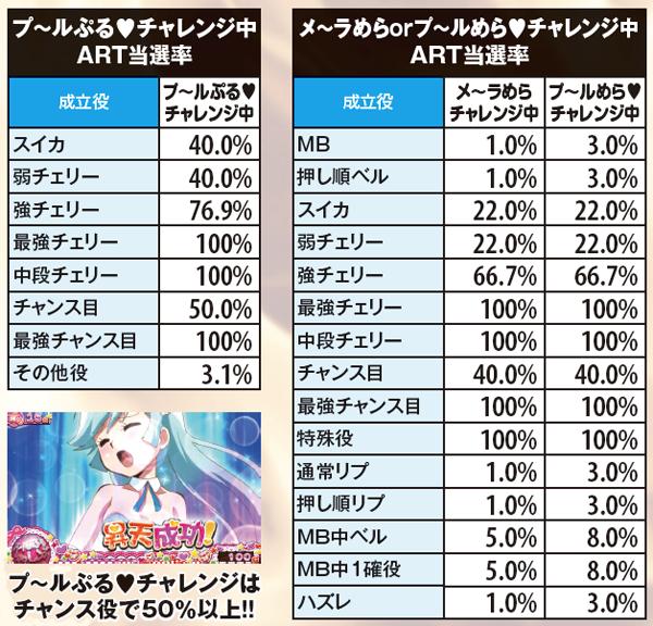 チャンスゾーン中の初当り当選率も判明。メ~ラめらチャレンジとプ~ルめら♥チャレンジの違いは、チャンス役以外の当選率となっている。