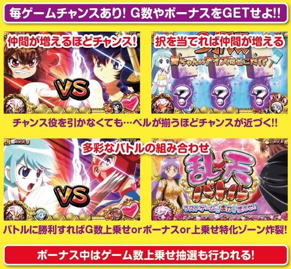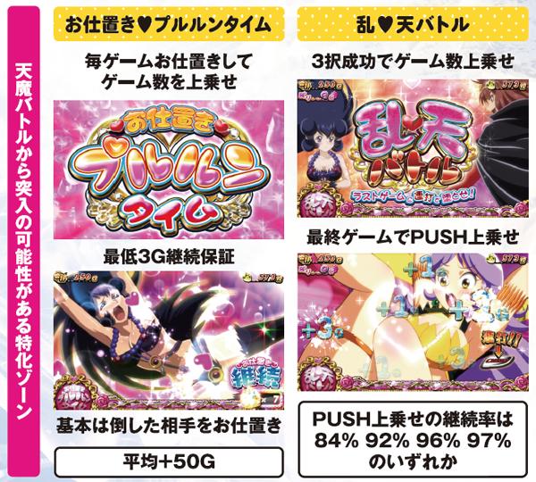 上乗せの鍵を握るのは3つのバトルで、天魔バトルと乱♡天バトルは天使を倒せば上乗せ確定。ラスボスと戦う最終決戦モードは勝利し続ける限りループし、また終了後もART引き戻しの特典がある模様。