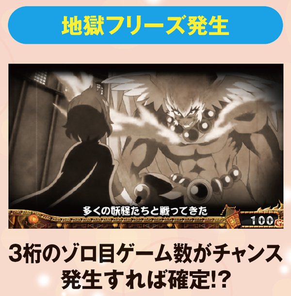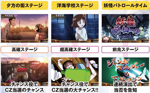 液晶で内部状態を示唆。高確や超高確ステージでチャンス役を引ければ、チャンスゾーン当選の期待度はアップする。妖怪パトロールタイムは前兆だ。
