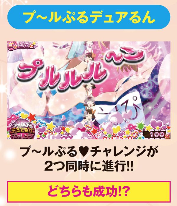 CZが豊富にあるのも本機の魅力の1つで、「メ~ラめらチャレンジ」中はチャンス役を引くと激アツ。「プ~ルぷるチャレンジ」はリールがぷるるんっと止まればチャンスで、2つのCZが重なった「プ~ルめらチャレンジ」は突入しただけで期待度は最高潮となる。