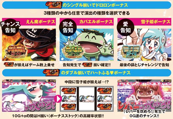 数々の名作を生み出してきた永井豪作品とのタイアップ機の中でも、ひと際H(ハートフル)な1台がKPEより登場。その名も『パチスロDororonえん魔くんメ~ラめら』である。 ボーナス絵柄のH揃いや天使に対するお仕置きで上乗せを獲得するなど、とことん「H」にこだわった仕様は出玉的にもビジュアル的にも超刺激的。 |