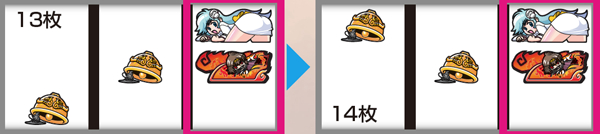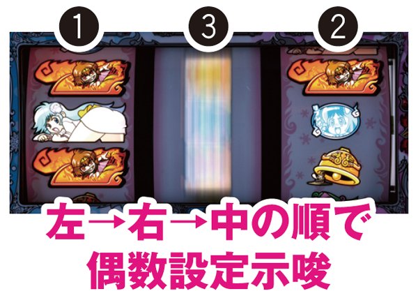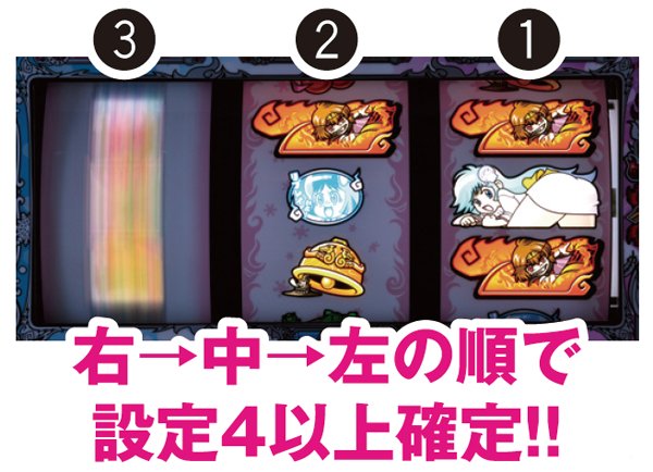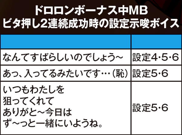 ドロロンボーナス中にMBが成立したら次ゲームに注目。ベル右上がりテンパイ(13枚)で、右上段に雪子姫をビタ押ししよう。成功したら、さらに次ゲーム(14枚)も右上段に雪子姫をビタ押し。成功すれば何らかのボイスが発生する(高設定示唆の選択率は2%程度)。