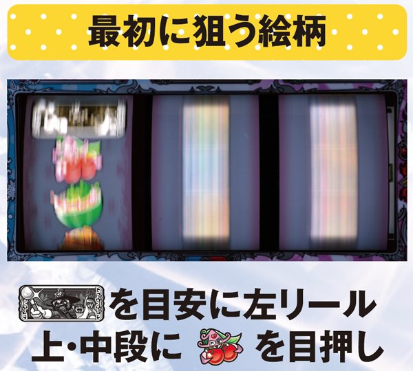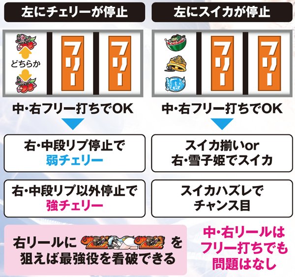 左リールにチェリーが停止したら中リールフリー打ち→右リールに赤7を狙う。左リールにスイカが停止したら中リールにスイカ狙い→右リールフリー打ち。スイカに強弱はなく、チャンス目時は必ず全停止後にリールフラッシュが発生する。右に「7・雪子姫・7」が停止すれば確定役だ。