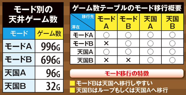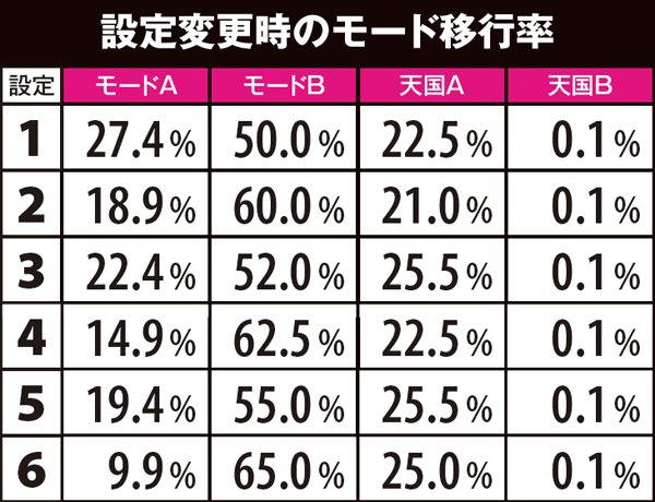設定変更時はモード移行抽選が行われ、偶数設定はモードB移行率が、奇数設定は天国移行率が若干優遇されている。