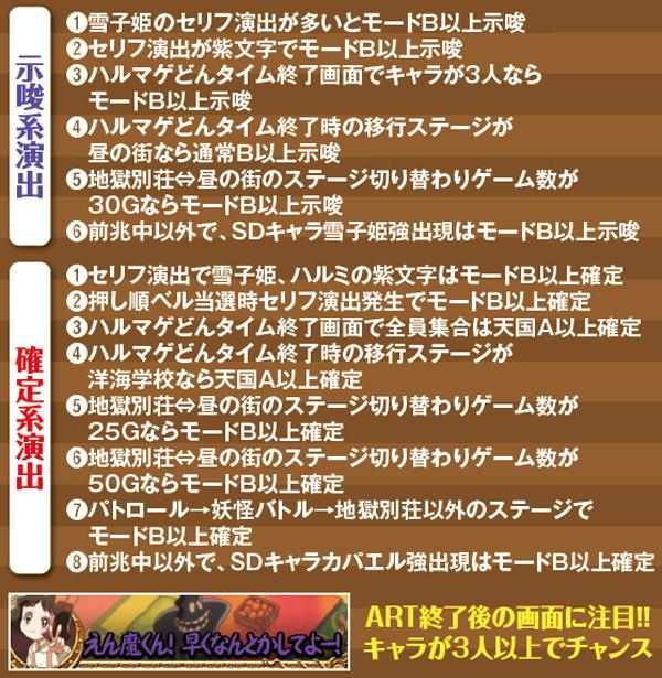 ARTハルマゲどんタイムはチャンス役のヒキ弱を嘆いている方にも優しい仕様で、メイン役のベルが揃うほど上乗せ契機である「天魔バトル」が近づく。また、たとえベルすら引けなくても規定G数消化によるバトル発展もある。