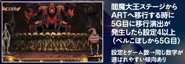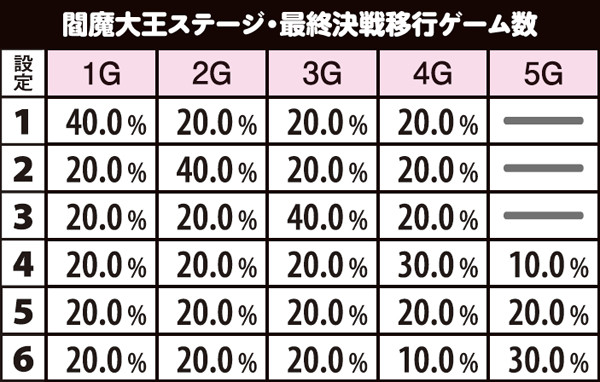 最終決戦モード終了後に移行する閻魔大魔王ステージで、5G目に移行演出が発生した場合も設定4以上が確定する。