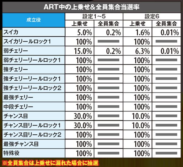 ART中の上乗せ&全員集合当選率・成立役別