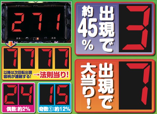 25年の時を経て伝説の7セグ機が復活! 7セグによる演出に注目で、「7」が停止すれば保留先読み連続演出が開始。次回転に停止する中出目の数字によって信頼度が変化するようだ。また「P」なら疑似連発生or継続となる。 |