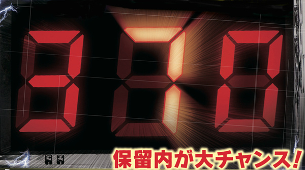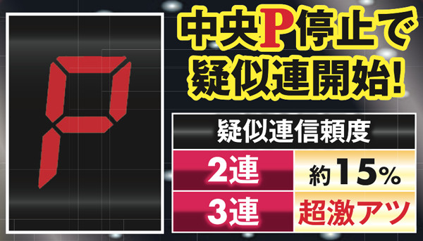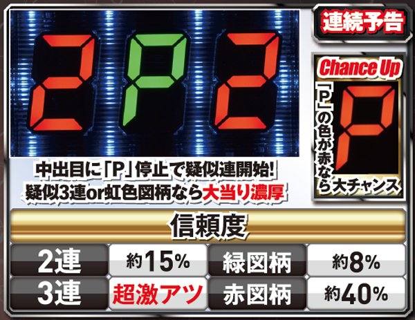 「7」が停止すればアツ〜い保留先読み連続演出が開始。次回転に停止する中出目の数字によって信頼度が変化するようだ。また「P」なら疑似連発生or継続となる。