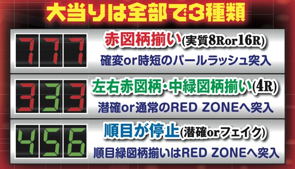 中出目の移行法則において注意しなければならないのは、停止する「数字」は分かるが「色」は分からないということ。赤図柄揃いがBIGorHYPER BONUS獲得なのに対し、中出目緑はREGULER BONUSとなってしまうので…赤図柄停止を祈れ。