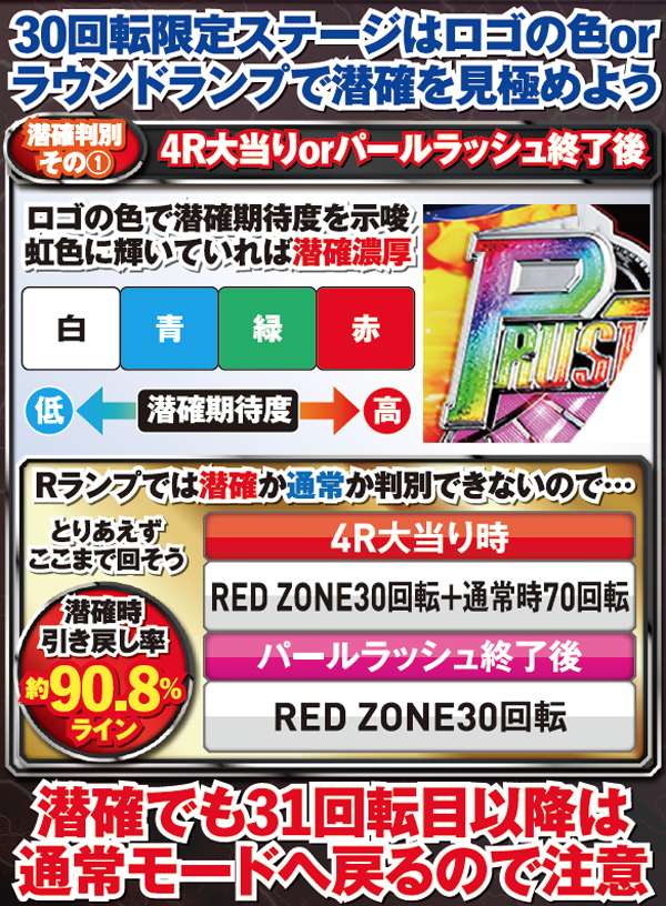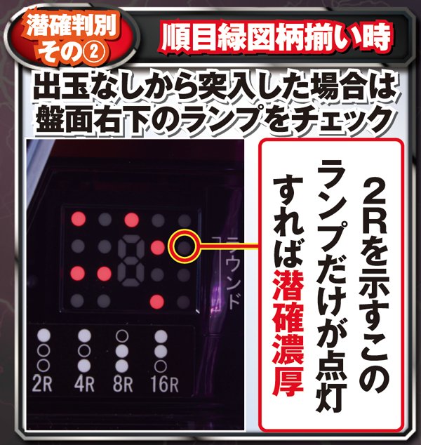 順目緑図柄揃い時はラウンドランプ点灯の有無で潜確判別できるが、4R大当り時orパールラッシュ終了後の判別は困難を極める。
