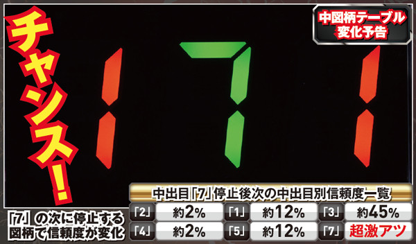 中出目に「7」が停止すれば保留先読みの合図。その際は次に止まる中出目の図柄に注目し、「3」の停止で信頼度約45%と激アツ、「7」ならば大当り濃厚となる。それ以外の数字でも、該当保留で赤系の予告or連続予告が発生すればビッグチャンス到来だ。