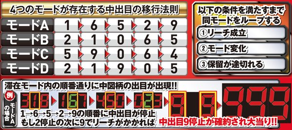 本機には中出目移行のモードが4つ存在。3つの条件のいずれかを満たすまで同じモードに滞在し、中図柄を順番通りにループし続ける法則性を持っている。これにより滞在モードを見抜けば次の停止図柄を予測でき、大当りを事前に察知できるのだ。