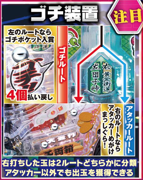 電サポ中、右打ちした玉は盤面右の「ゴチ装置」を通過し左右に振り分けられる。右のルートならアタッカーへ直行、左のルートならゴチポケット入賞→4個の賞球が得られ、大当り時はボーナス以外にも上乗せして出玉をゲットできる仕様だぞ。