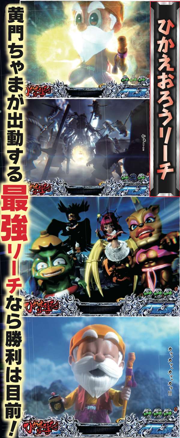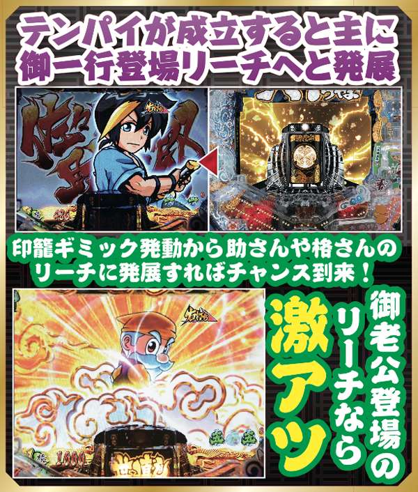 ST中は無敵の刻へ突入、または赤や金系の予告が発生すればリーチ発展の好機。助さんや格さん登場ならチャンスとなり、御老公が登場するリーチならば勝利へ王手をかけるぞ。図柄揃い後はボタンを押して宝船ギミックが落下すれば16R獲得だ。