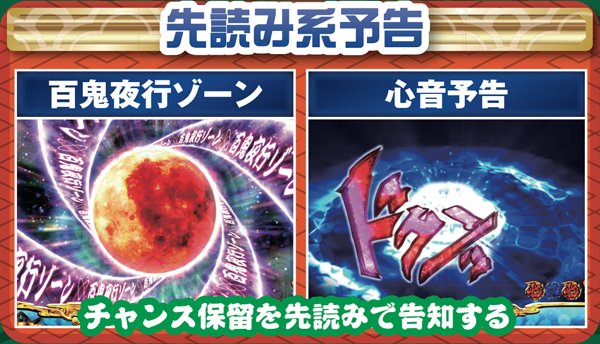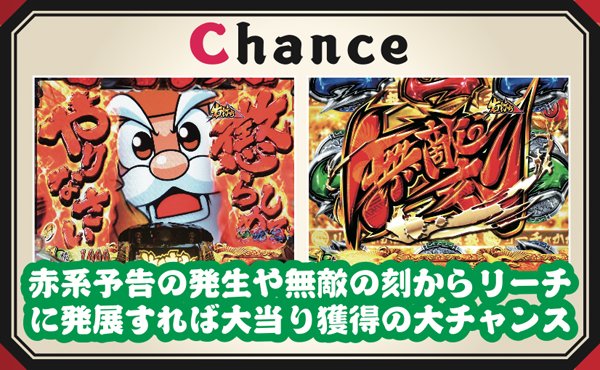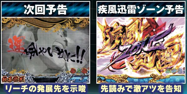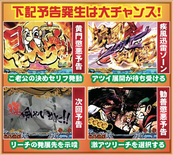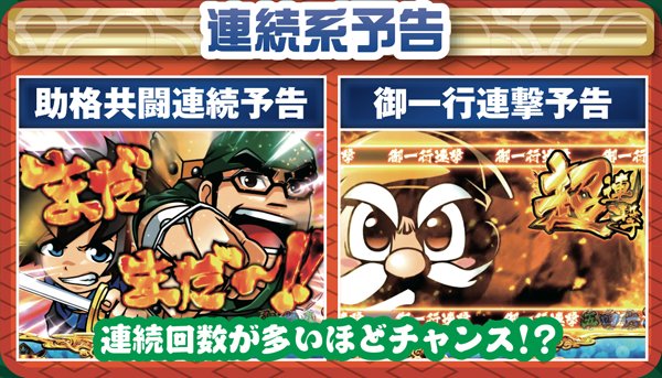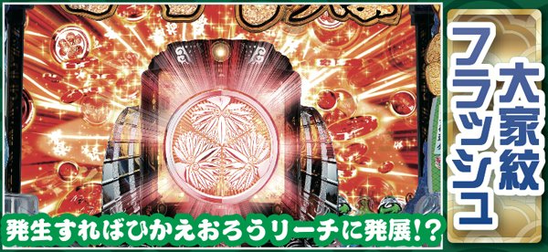 先読み系の予告が発生すればチャンス到来。当該回転で疑似連が3連以上継続し、勧善懲悪予告や次回予告などが出現すれば、アツいリーチへひとっ飛びだ。大家紋フラッシュ発生なら最強リーチへと発展するぞ。