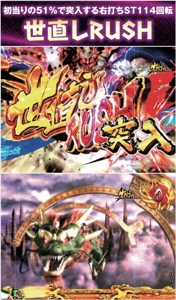 初当りの49%で突入する時短。モード中に発生する九尾とのバトルに勝利すれば、世直しRUSHに突入する。