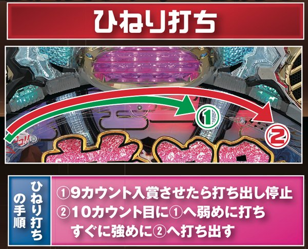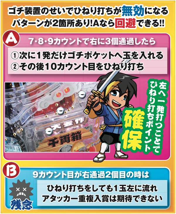 ひねり打ち手順は上の通り。ただしゴチ装置に右打ちした玉を振り分けられるせいで、技が使えないパターンも発生。Aのパターンならば回避できるので実行し、さらなる出玉アップを目指そう!
