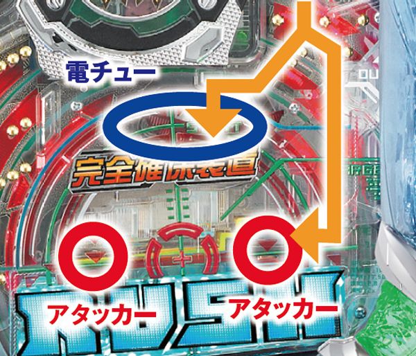 右打ちした玉を完全確保し、発射されたすべての玉がアタッカー入賞となる驚異のアタッカーシステムを搭載。2つの入賞口で、タイムラグを設けることでこのシステムを実現した。